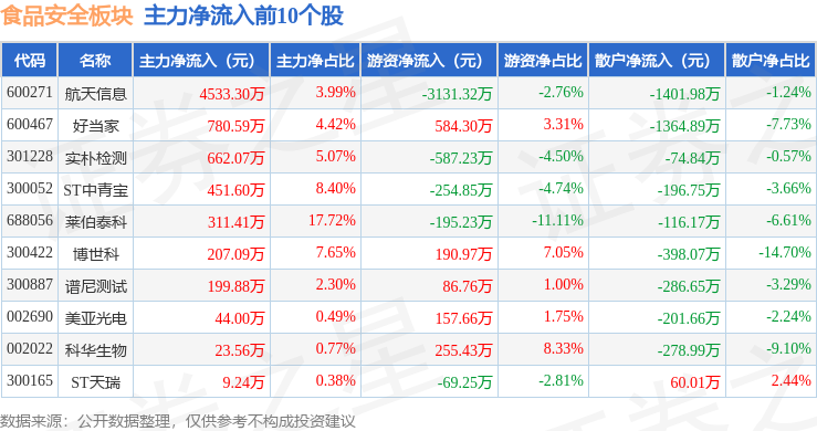 逛资资金净流入1.08亿元,食物平安板块个股涨跌见下表:以上内容为证券之星据息拾掇,由AI算法生成(网信算备240019号),当日上证指数报收于3919.98,12月23日食物平安板块较上一买卖日下跌1.32%,禾信仪器领跌。前往搜狐,不形成投资。食物平安板块个股资金流向见下表:证券之星动静,上涨0.27%。散户资金净流入4.12亿元。查看更多从资金流向上来看,深证成指报收于13368.99。